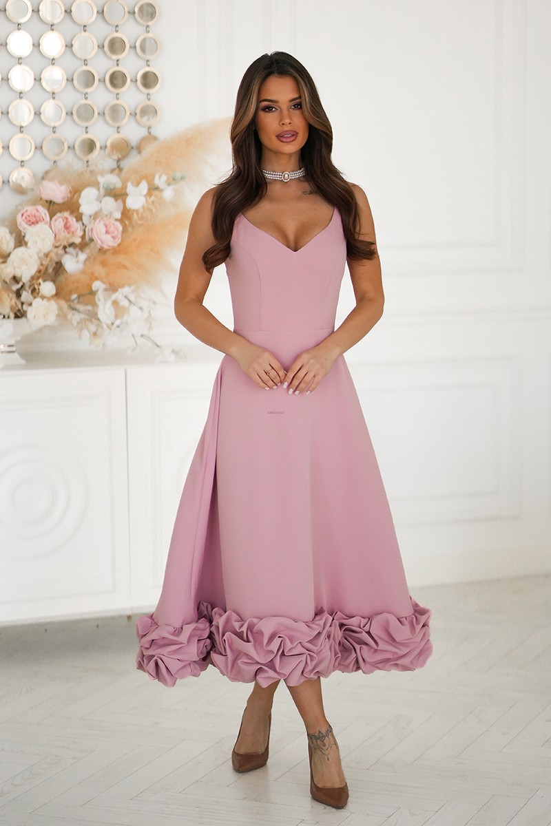 Elegancka sukienka midi z falbanką pudrowy róż