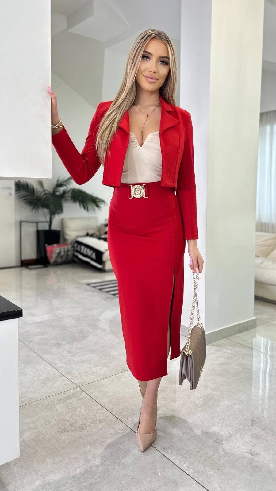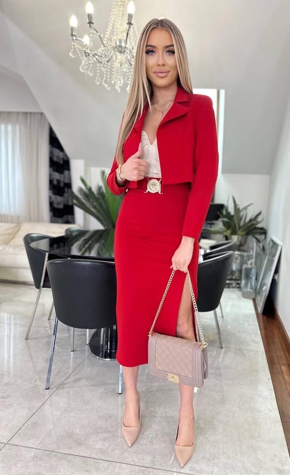 Komplet SEMPRE krótka marynarka+spódnica midi ołówkowa złote dodatki czerwony