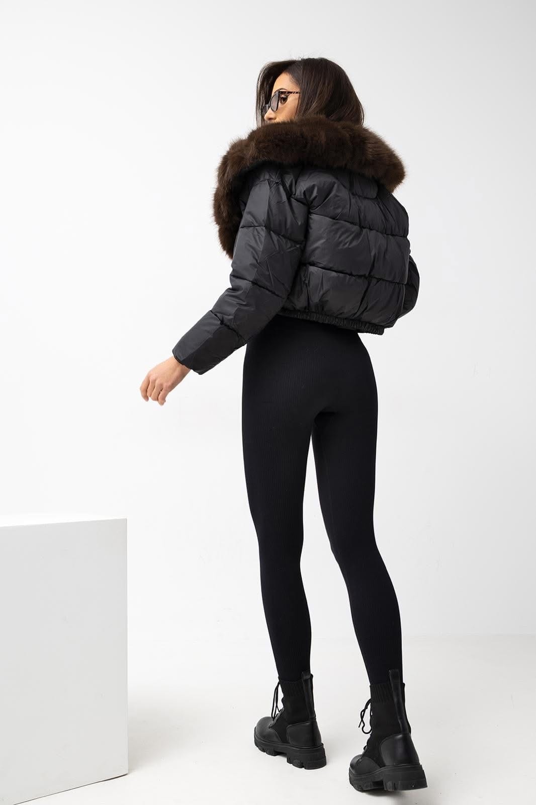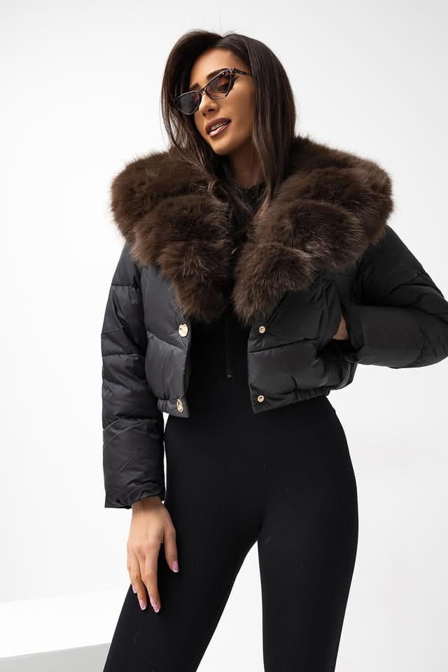 Krótka kurtka przejściowa z odpinanym futerkiem. Kurtka posiada ocieplenie, zapinana na złote napy. Posiada boczne kieszenie.