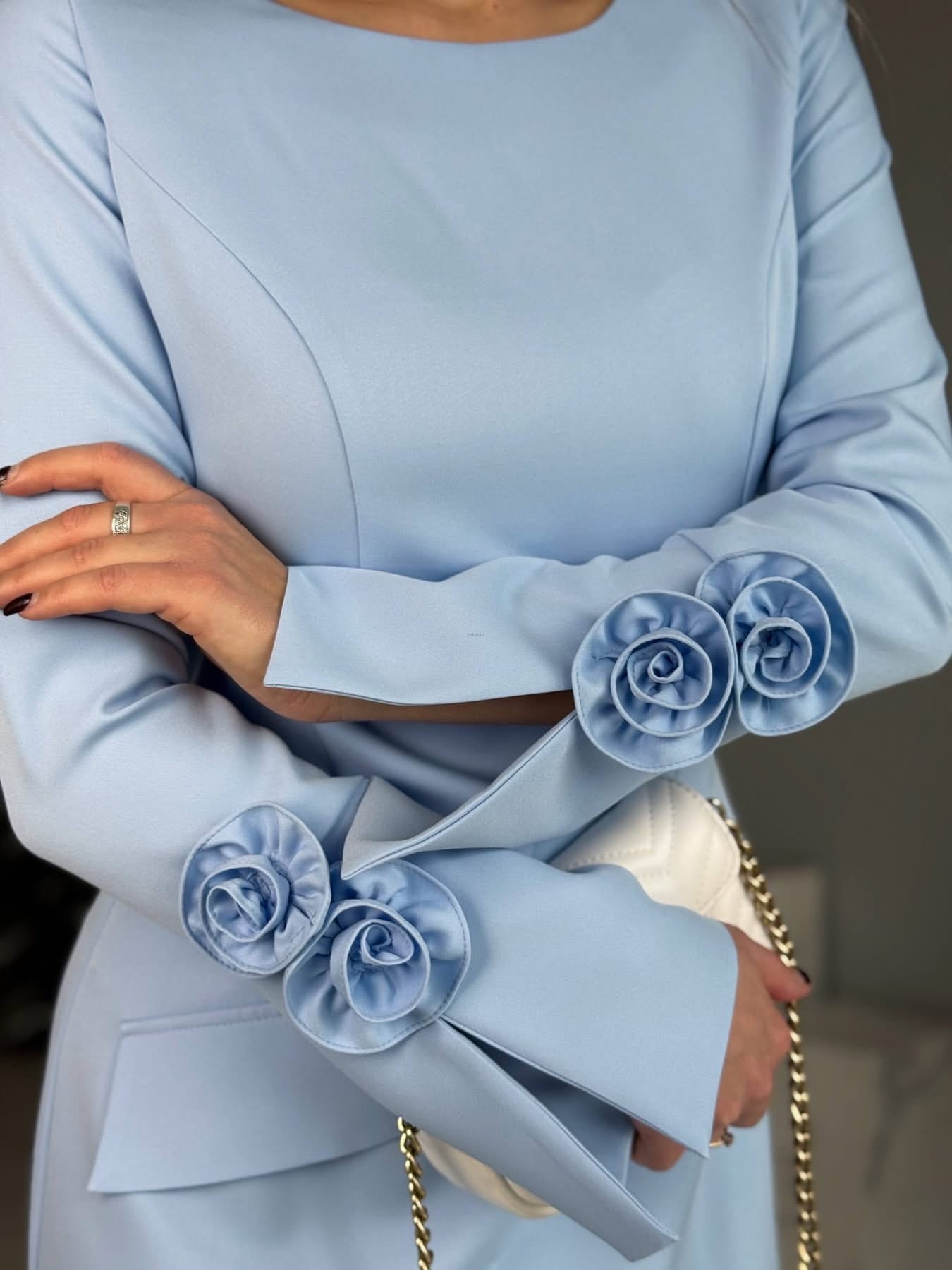 Klasyczna a zarazem bardzo kobieca i efektowna sukienka w wersji mini, sukienka została wymiana z najwyższej jakości materiału, jej mankiet jest rozszerzony z efektowną różą która nadaje stylu, plecy są taliowane co podkreśla kształty, zapinana jest na kryty zamek.