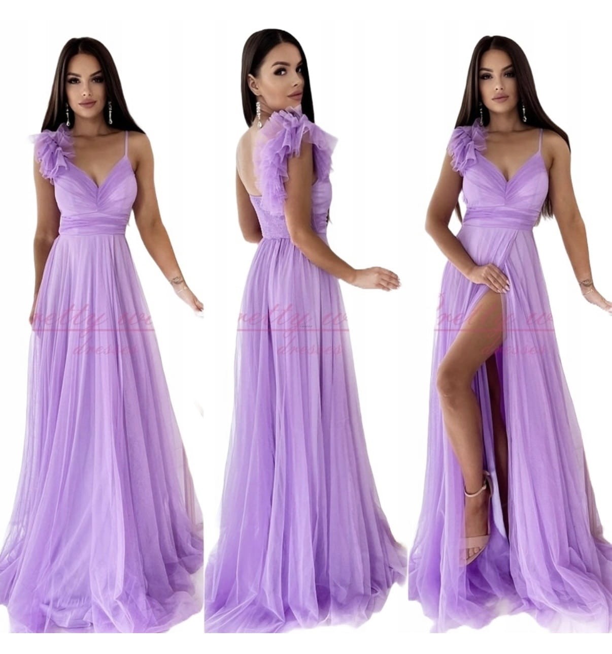Tiulowa sukienka MILAGROS MAXI na ramiączka rozcięcie na nogę 34.36.38.40.42 wrzos fiolet