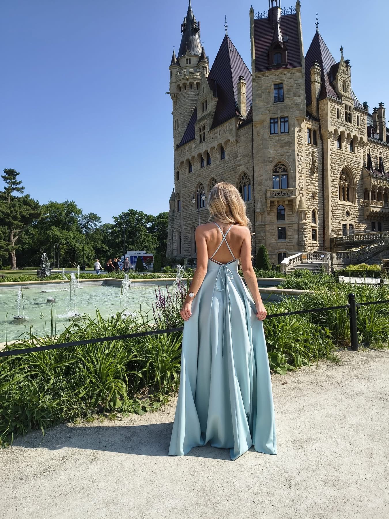 Sukienka wykonana jest z lekkiego lejącego materiału który pięknie prezentuje się w tańcu.